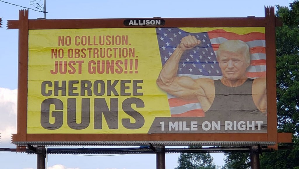 MURPHY, N.C. — A western North Carolina gun store is getting attention for a billboard mocking four U.S. congresswomen. Cherokee Guns in Murphy, NC has a pointed message for four U.S. representatives at odds with President Trump. The OOH company’s, (Allison Outdoor) poster displays photos of Reps. Alexandria Ocasio-Cortez of New York, Ilhan Omar of Minnesota, Ayanna Pressley of Massachusetts and Rashida Tlaib of Michigan. Above the photos is the message, ‘The 4 Horsemen Cometh.’  ‘Cometh’ is lined out and replaced by ‘are idiots’ in red. Below the photos, reads: ‘Signed, the Deplorables.’