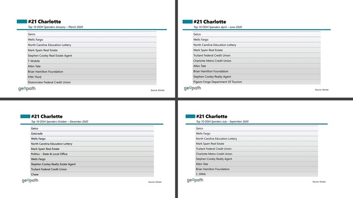 Geico spent the most in OOH overall in 2020, and were among the top ten OOH spenders in 71 of the top 100 DMAs for the entire year! Additionally, Geico was the top spender for the entire year for ten of these markets, and in Charlotte, the brand topped the list in all four quarters of 2020!