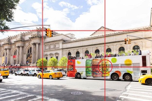 While shooting and framing our shots, it is important to be cognizant of where the viewer’s eye will naturally land. Transit advertising, buses, shelters and billboards are all located on or alongside the road, which if framed improperly can distract from the ad piece. I like to use the tried and true photography method of “the rule of thirds”. With this composition technique, the photographer is creating a mental grid, composed of two vertical and two horizontal lines. Placing the subject at points where the lines intersect will help ensure the viewer’s eye is naturally being drawn there. Shooting in busy dense areas, or visually chaotic locations like the heart of Times Square, can be challenging. By framing with this rule in mind you can ensure the intended subject of the photo is the first thing you notice.