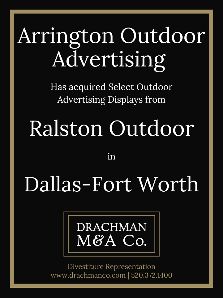 Dallas, Texas – Ralston Outdoor (“Ralston”) announced today the divestiture of select Outdoor Advertising Assets to Arrington Outdoor Advertising (“Arrington”). Drachman M&A Co. represented seller Ralston in the transaction. Terms of the deal were not disclosed.