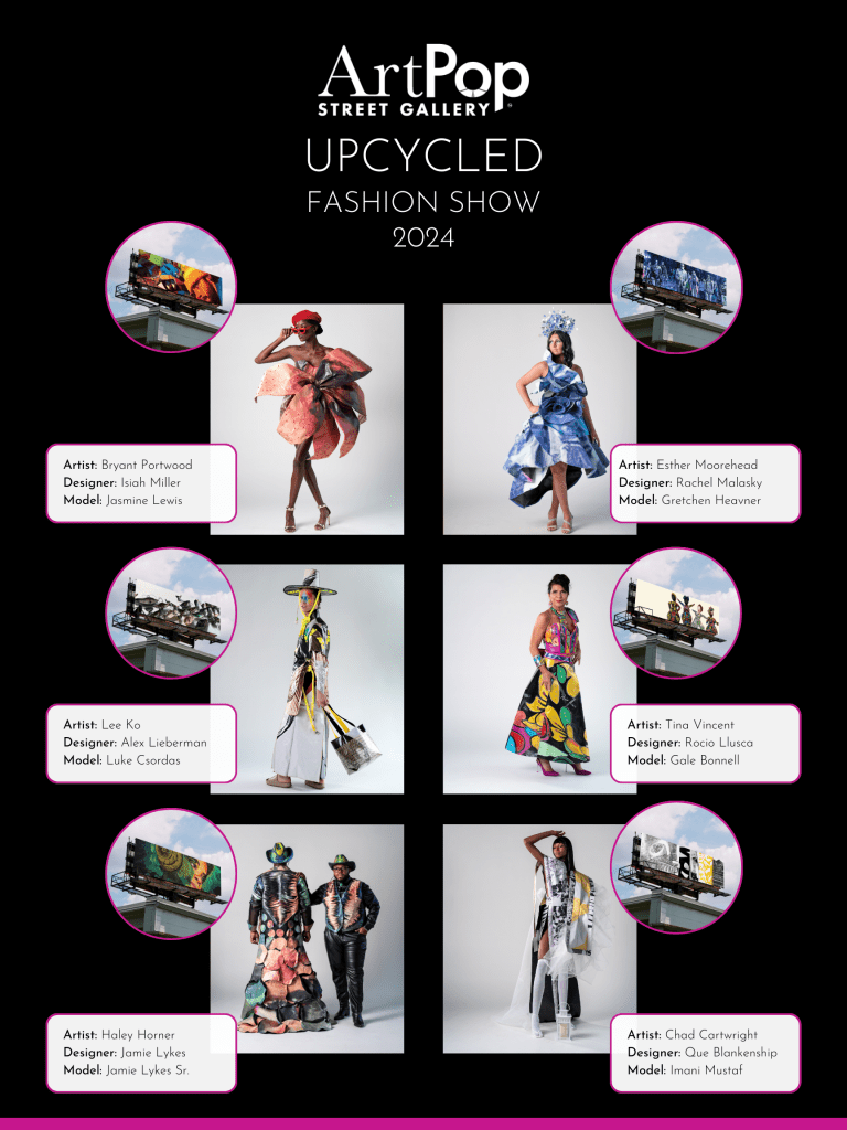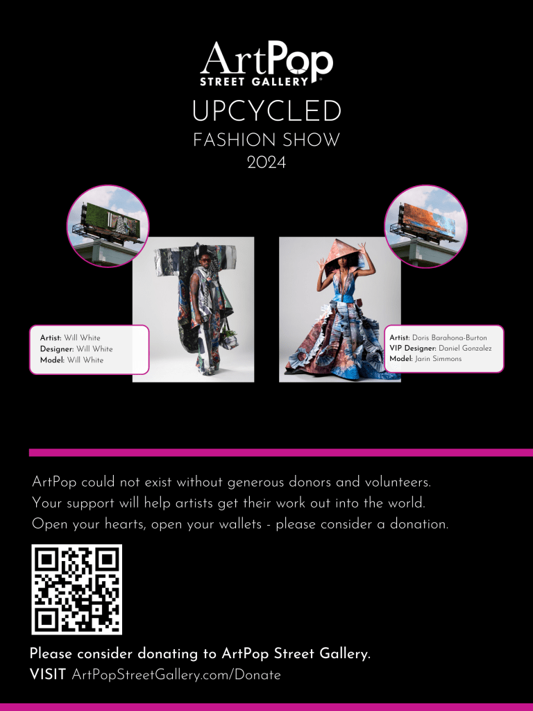 The Upcycled Fashion Show demonstrates ArtPop’s continued commitment to the local arts community and sustainability. ArtPop’s Upcycling Initiative repurposes materials used in ArtPop’s Cities Program – its annual juried exhibition in which 20 local artists are showcased on donated billboards and other public media space throughout the region. With this initiative, ArtPop successfully keeps over 13,00 square feet of vinyl out of landfills annually and creates wearable, statement designs.