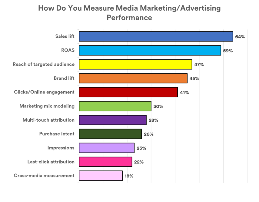 The study found that measuring Sales lift is the top way marketers evaluate advertising performance (64% of respondents). This was followed by Return on ad spend (ROAS, 59%), Reach of targeted audience (47%), and Brand lift (45%). Reach was the top “audience exposure” metric on the list, with impressions ranking 9th at 23%.