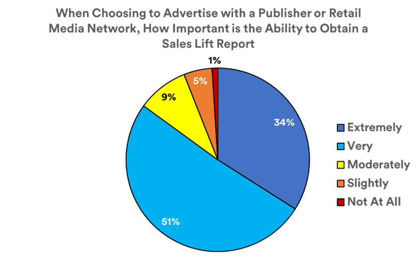 The importance of Sales Lift reporting cannot be overstated. 85% of respondents said it is either Extremely or Very Important they are able to obtain a sales lift report when working with a publisher or retail media network.