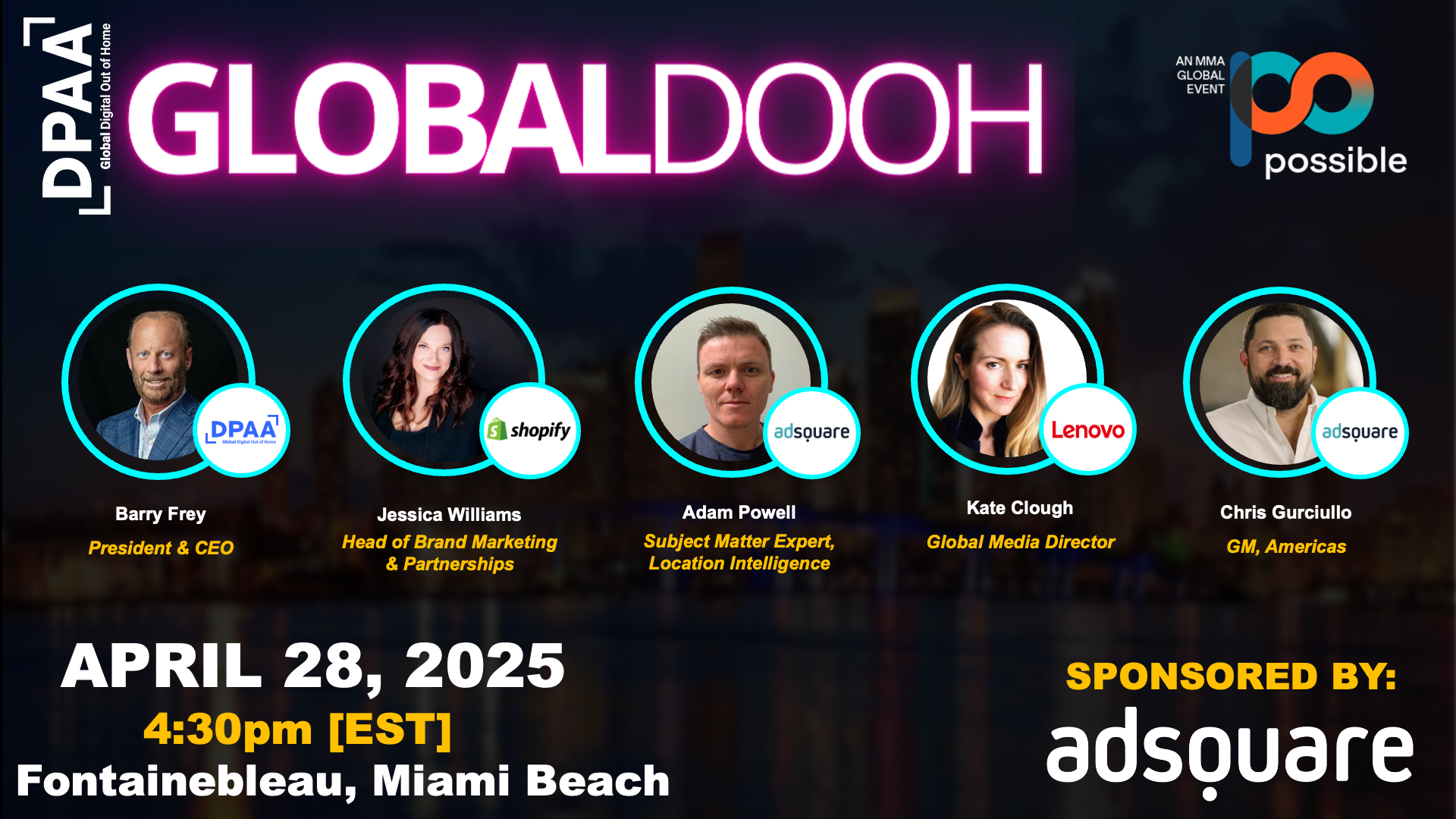NEW YORK – DPAA, the global trade marketing association driving the growth and digitization of out-of-home media, announced today speakers for its GlobalDOOH session at the Possible Conference in Miami later this month. GlobalDOOH takes place on April 28, 4:30pm at the Fontainebleau Hotel in Miami. The session is sponsored by Adsquare. Speakers at this year’s event include: