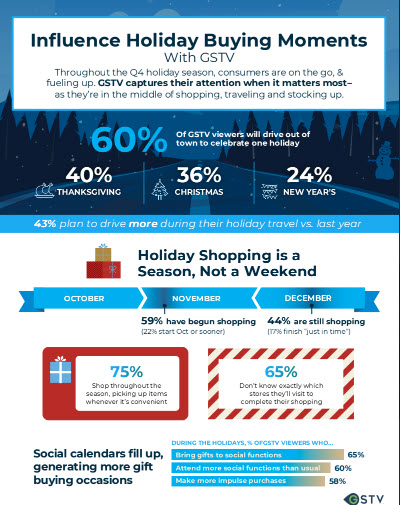 Eric Z. Sherman, Executive Vice President, Insights and Analytics, GSTV, said, “The holiday season is naturally an occasion for gathering with family and friends, and for tackling holiday shopping at retailers of all varieties. Our research shows that both of these seasonal trends mean folks will spend more time on the road and less time with traditional media. For marketers, this represents an elevated opportunity to connect with consumers on-the-go – especially Gen Z audiences, who have expressed a renewed interest in in-store shopping experiences. In a cloudy economic environment, an advertising strategy that ties directly to shopping behavior at its peak may be an effective approach for brands looking for outsize impact in Q4.”