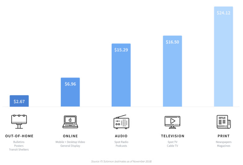 OOH requires an initial investment, but the overall costs are far less than other mediums. According to the leading financial advisory firm, PJ Solomon’s major media CPM estimates online, audio, television and print ads can cost anywhere from $6.96 to $24.12 per thousand impressions. In contrast, out-of-home advertising generally costs less than half that amount, at just under $3 per thousand impressions.