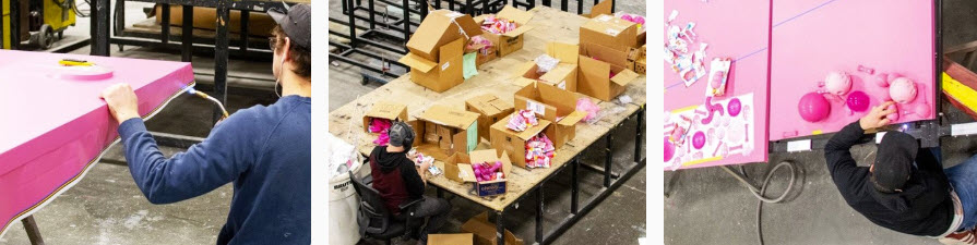 We purchased more than 2,000 pink dog toys from Pet Smart and PetCo to outfit the mural. (The cashiers thought we were nuts as we brought cart after cart of toys to their checkouts.)