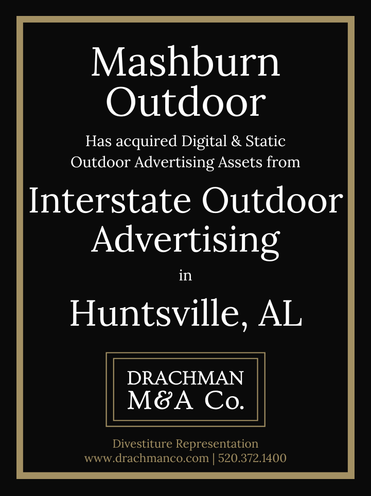 Huntsville, AL – Mashburn Outdoor (“Mashburn”) announced today their acquisition of Outdoor Advertising Assets in Huntsville and Decatur, Alabama from Interstate Outdoor Advertising (“IOA”), a division of Nowlin Development Company, LLC (“NDC”). Drachman M&A Co. represented IOA in the transaction. Steve Grant of Grant, Konvalinka & Harrison provided legal representation to Mashburn. The transaction included four digital displays along with static coverage of the market. Terms of the deal were not disclosed.