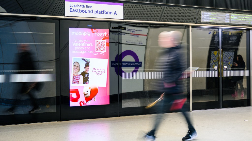 Sharing the love in the run up to February 14th, Moonpig and Heart, the UK’s biggest radio brand, have created a co-branded campaign at Tottenham Court Road station, featuring a takeover of every digital screen on the Elizabeth line platforms.