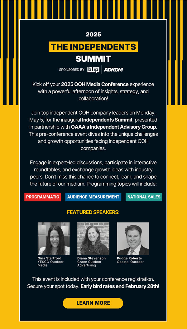 The OAAA invites you to join them for an inaugural event to kick off your 2025 OOH Media Conference experience. In partnership with OAAA’s Independent Advisory Group, the Independents Summit tackles the unique challenges and opportunities of independent OOH companies.