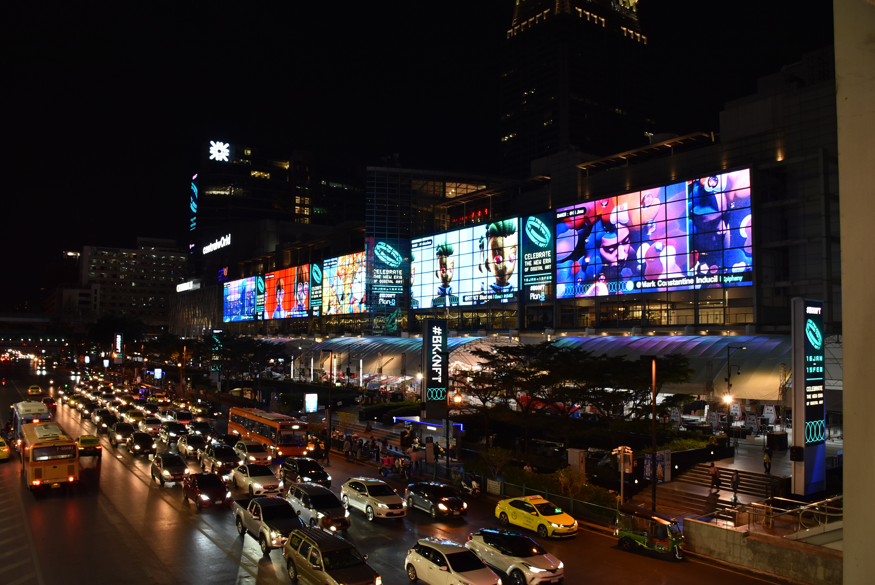 In #BKKNFT, these renowned works, which may be accessible to limited online communities, are now seen by the wider public. Our high-impact network of out-of-home media turned art gallery aims to build awareness and inspire millions of people to join the blockchain and NFT community. Featured artworks are being displayed on 900 screens (43,000 sqm combined – or the size of 6 football fields) on the streets of Bangkok and throughout Thailand ). #BKKNFT will be ongoing until 15 Feb 2022.