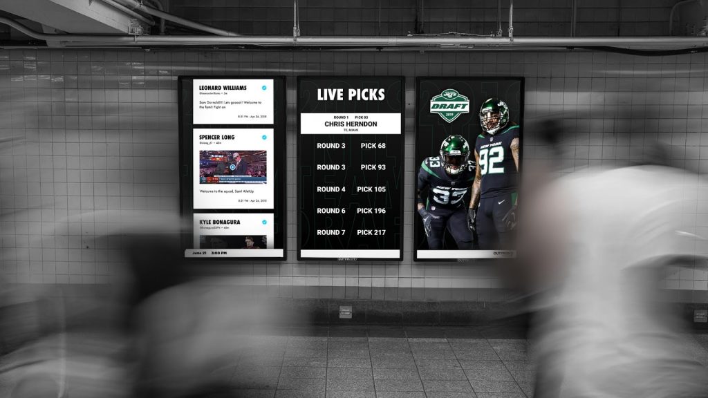 Beginning Thursday, April 25 through Sunday, April 28, OUTFRONT Media showcased the Jets near-real-time picks for the 2019 NFL Draft alongside the Jets Twitter feed on the company’s Liveboard digital displays in subway stations throughout New York City. Prior to the draft, the Liveboards, displayed a countdown to the draft’s start time on Thursday evening.