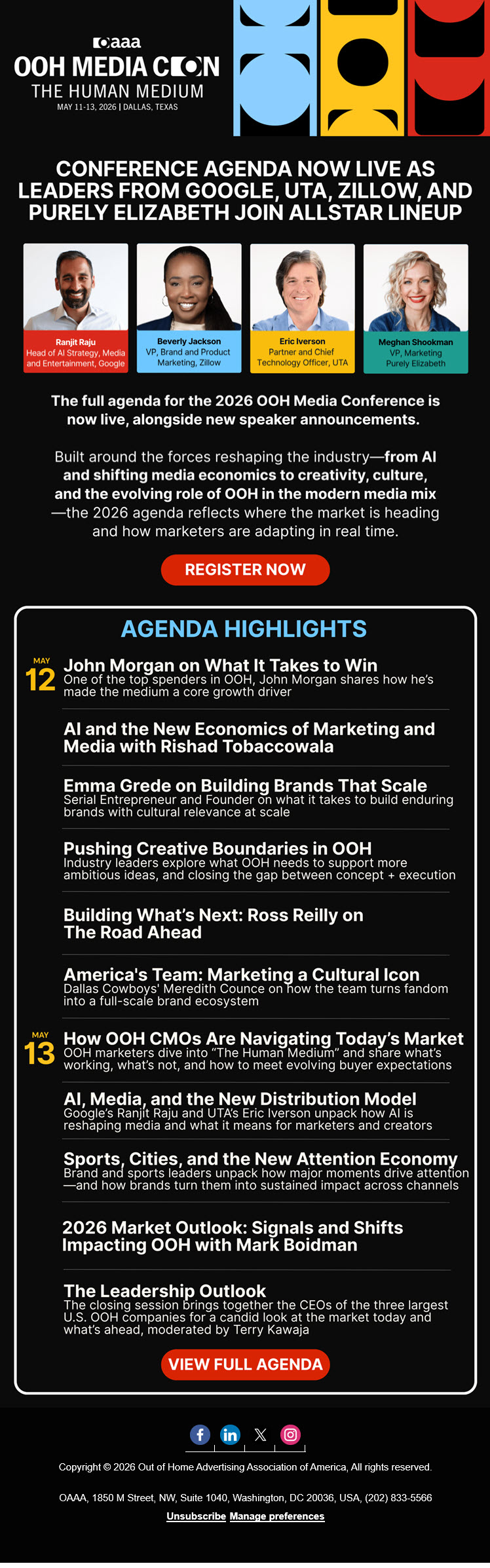 To view the full agenda and register for the 2026 OOH Media Conference, visit ooh2026.com/agenda.