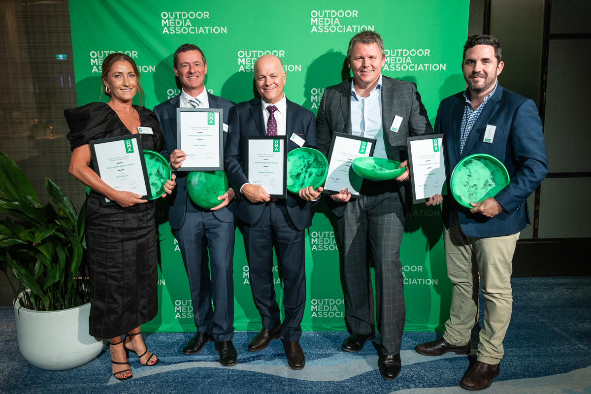 Outstanding Service Award NSW | Cassandra Cameron – JCDecaux QLD | Joint Winners: Elise Taylor – oOh!media and Nick McAlpine – Bishopp SA | Russell Bilsborow – JCDecaux VIC | Christian Zavecz – QMS WA | Mark Treasure – oOh!media |