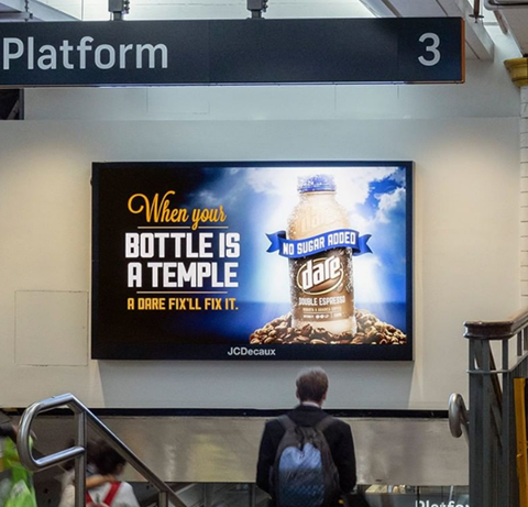 When your bottle is a templeAustralia: Sydney Town Hall’s newest digital signage, showcased Dare Iced Coffee’s eye-catching creative. Known for their witty copy lines, this campaign is a perfect example of how to use minimal text with compelling product images. Creative: AJF |