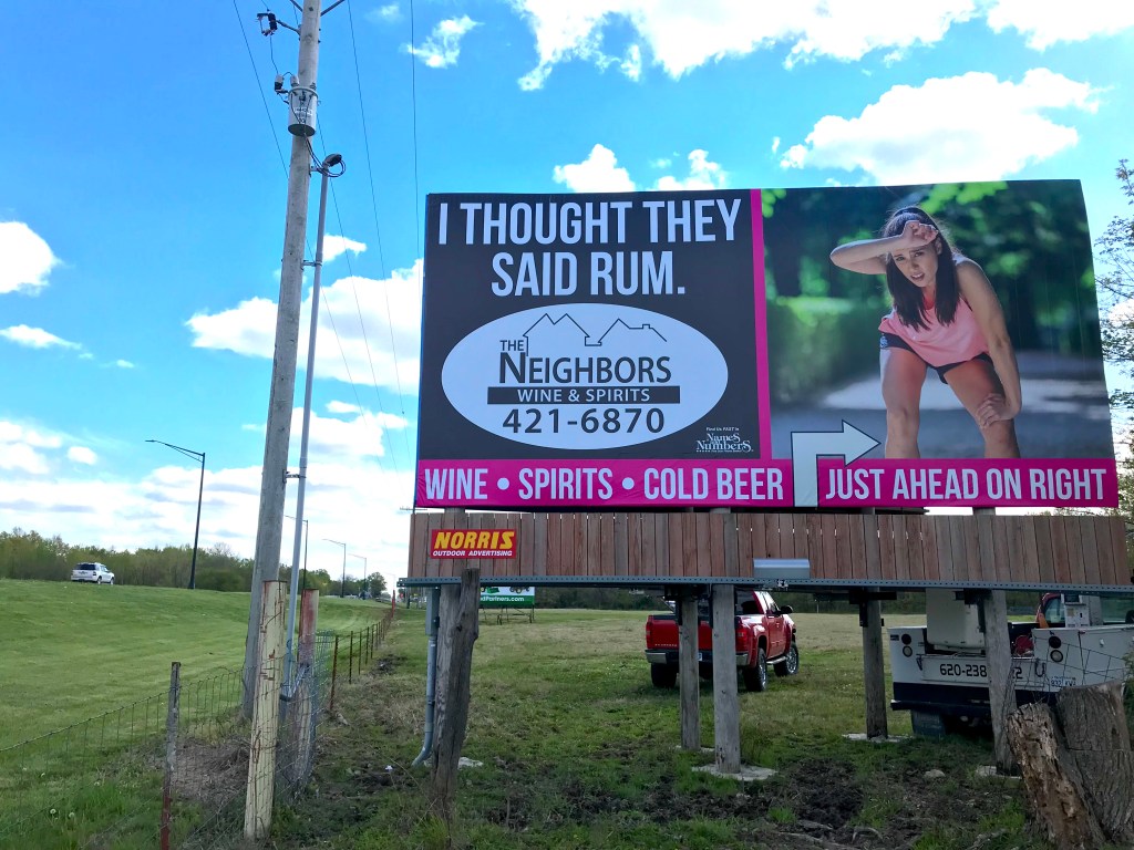 We have a local liquor store in Parsons, KS, called The Neighbors, that loves to capitalize on funny boards and change them up every season. This spring we produced this board for them and everyone loves it! We still get comments on this board today even though it’s been up for almost 2 months already. Norris Outdoor Advertising
