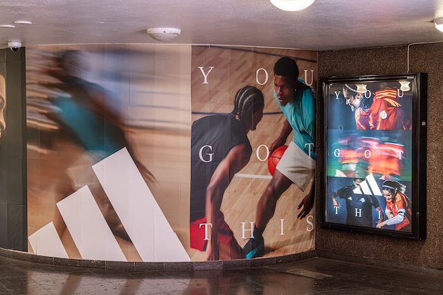 Catch the latest campaign for adidas in a station domination at Östermalmstorg and billboards in the subway in Stockholm. | GroupM Sverige, Clear Channel Sweden, Ocean Outdoor Sweden, Leeads Commercial Partner, OLIVER Agency