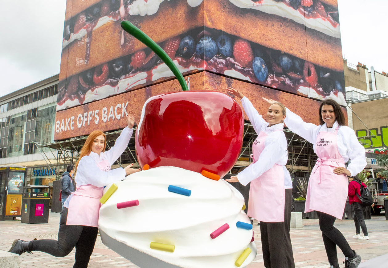 promotes the return of the Great British Bakeoff with a 78ft slice of cake and a cherry on top – in the heart of Glasgow’s city center! 🍰🍒