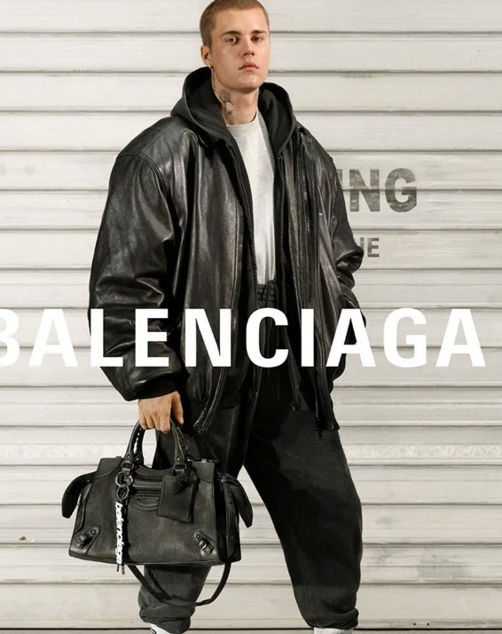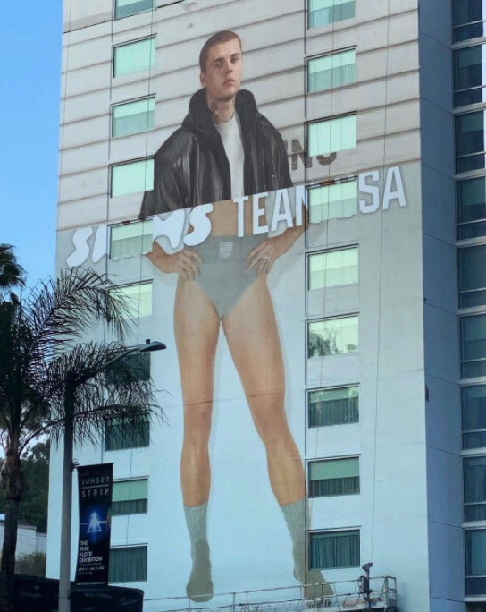 When installers were in the middle of removing a previous SKIMS billboard for a new ad featuring Justin Bieber wearing a pair of Balenciaga trainers.