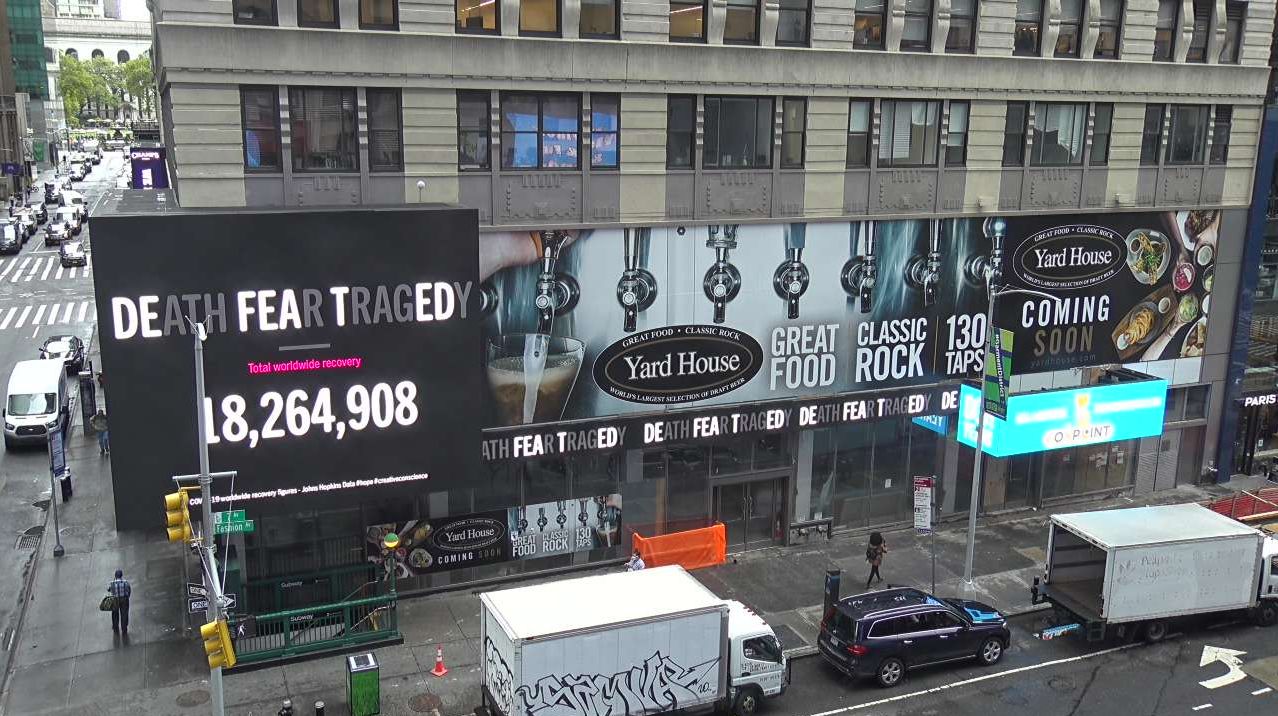 As the world continues to recover from an international scare, Foxpoint and @voodooh_ teamed up to broadcast a positive message. Voodooh created a campaign that tapped into live and rising “Total Worldwide Recovery” numbers provided by John Hopkins Data. Foxpoint displayed the campaign on their 10 Times Square location. The unique creative highlighted letters from the words “DEATH FEAR TRAGEDY” to spell out “DEFEATED” which promotes a positive outlook. Dynamic DOOH content with livestreaming features