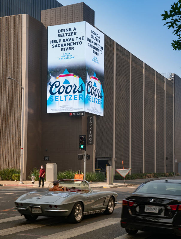 This is a great example of Surprise & Delight…” Drink a Seltzer…Help save the Sacramento River.” The river is just 4 blocks from this display and today was 99 degrees. Great job MillerCoors and Kinetic Worldwide on a perfectly targeted and timed execution!,#Marqueefullmotiondigital