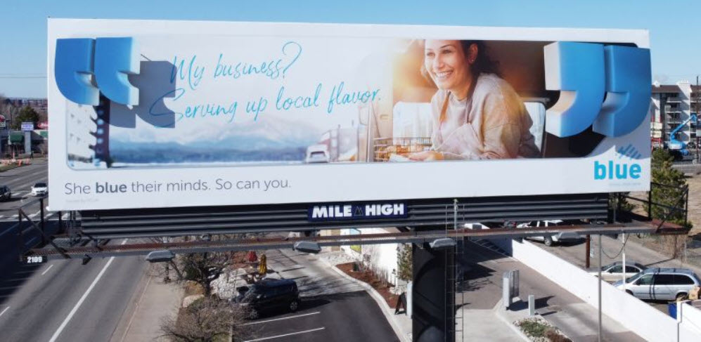 Innovative use of 3D with the quotation marks right and left. Mile High Outdoor for blue