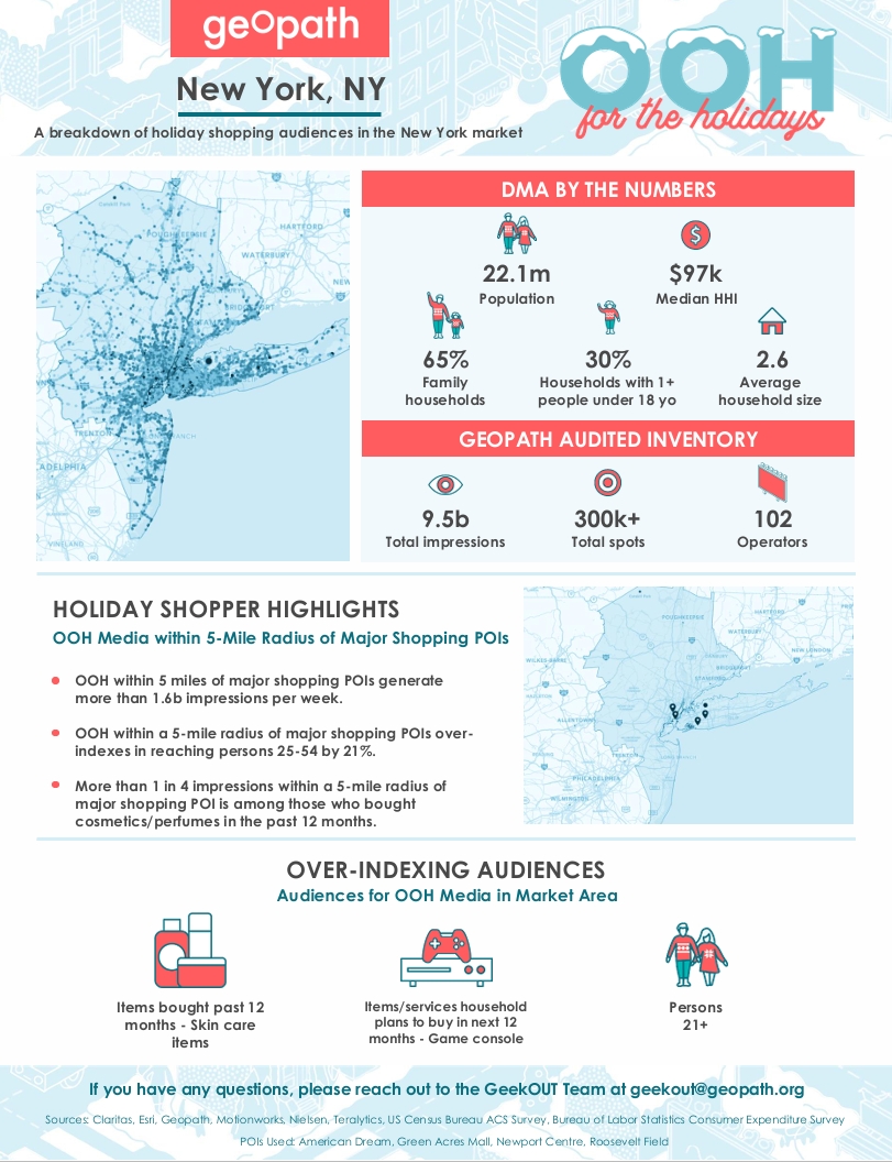 Below you’ll find the New York DMA “OOH For the Holidays” Infographic. Infographics for the other 10 DMAs can be found in the geekOUT Library, accessible to Geopath Members.