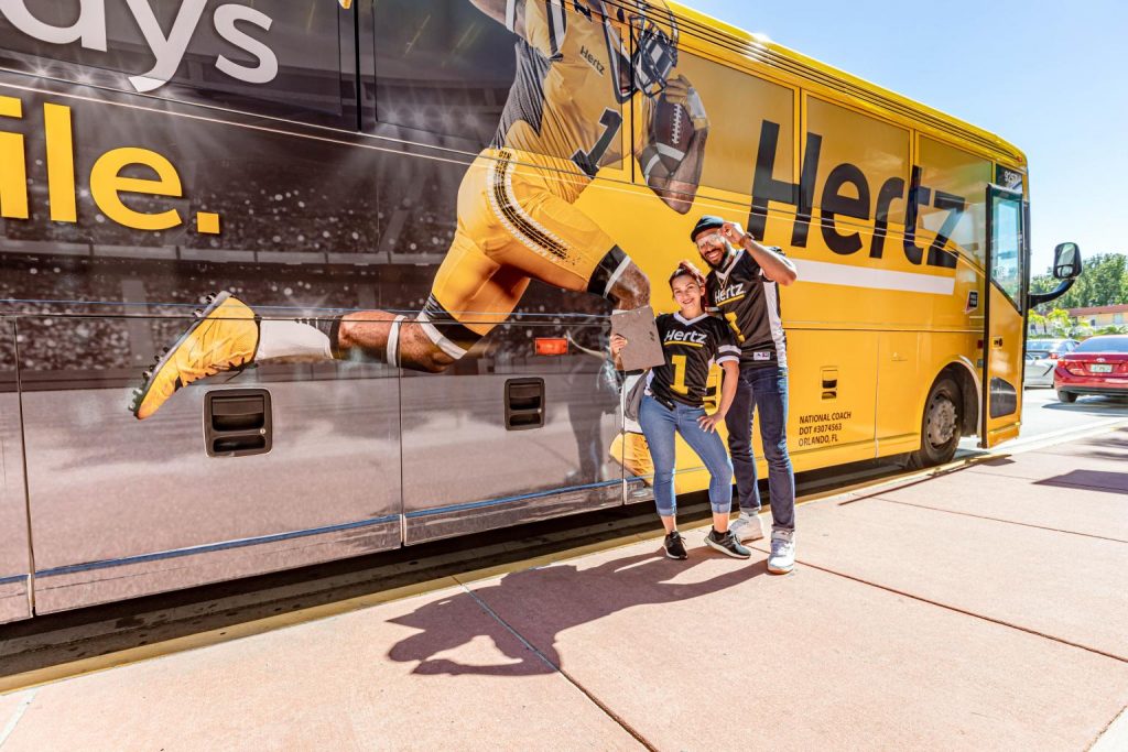 Vector Media went the extra mile for Hertz this past weekend at Super Bowl LIV in Miami! Tapped to help Hertz celebrate their Gold Plus Members by giving them a unique VIP game day experience! Sports trivia, branded premiums and refreshments were all part of the VIP fleet experience on Vector branded Upper Decker buses, giving rides to and from the big game!