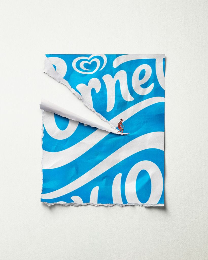 Top-scoring this month is an ad from Spain for Walls Cornetto ice cream, an appropriate summer winner with a visual pun that works on multiple levels – no words required. The poster shows a surfer riding a wave, a classic summer image. But the ocean he’s surfing on is the blue and white wrapper of a classic Cornetto ice cream, and the surf is the trail of torn paper as that wrapper is opened. So, in a single image the designer has captured and linked two strong, positive emotions – the sense of sunshine and freedom we associate with surfing, and the anticipation and indulgence of opening a Cornetto.