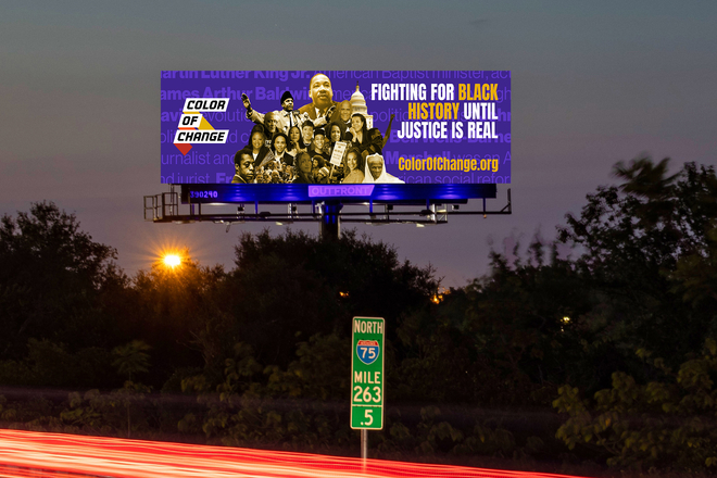 Color Of Change builds upon its 2021 campaign “Until Justice Is Real” by expanding with transit OOH inventory, along with billboards in multiple markets across the country. The creative, designed by Fufu and Grits, a Black-owned and Black-led creative studio, merges the past and future of Black History in a simple, bold, and digestible way that speaks to the large target audience to encourage action.