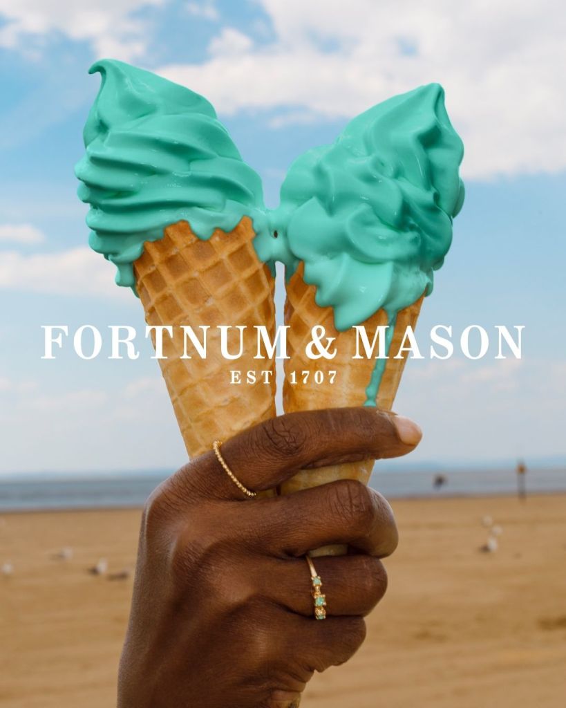 Fortnum & Mason, meanwhile, have quite a different angle on a holiday treat. They’ve recruited award winning artist and photographer Martin Parr to take unusual images of the British Summer, like this one of an elegant Black hand holding up a very lurid blue ice cream cone. The contrast between the blue ice cream and the green lawns behind is vaguely surreal and makes the ad stand out immediately, while still capturing some of the essence of the British summer. Audiences responded warmly to the poster, giving it a 3.3-Star Rating firmly above the UK outdoor norm.