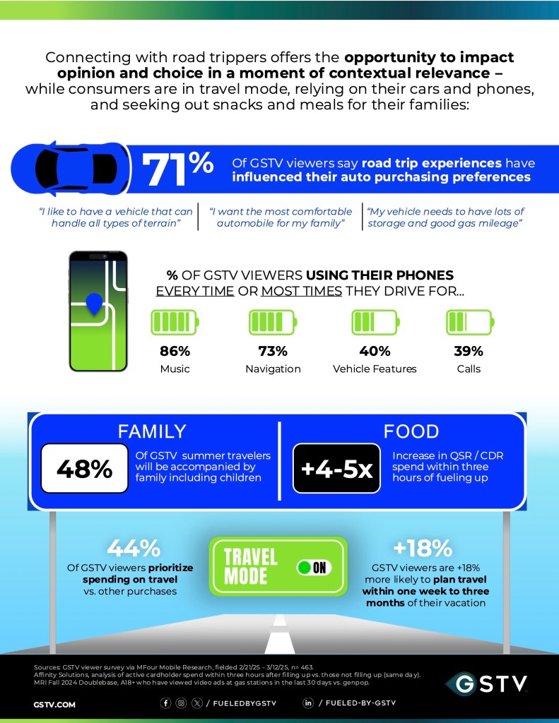 GSTV, the national on-the-go video network engaging and entertaining targeted audiences at scale across tens of thousands of fuel retailers, unveiled today their 2025 Summer Travel Insights, noting that a large majority of their viewers will be opting for road trips instead of travel by air for their summer vacations. In a GSTV viewer survey conducted via MFour Mobile Research, 83% said they plan to drive to their summer vacation destination, and 54% said they will drive instead of fly due to the increasing cost of airfare. High airfare costs have also led 39% of survey respondents to wait longer to finalize summer travel plans. Longer driving distances also don’t seem to deter drivers, with 60% planning to drive 300+ miles on vacation this summer.
