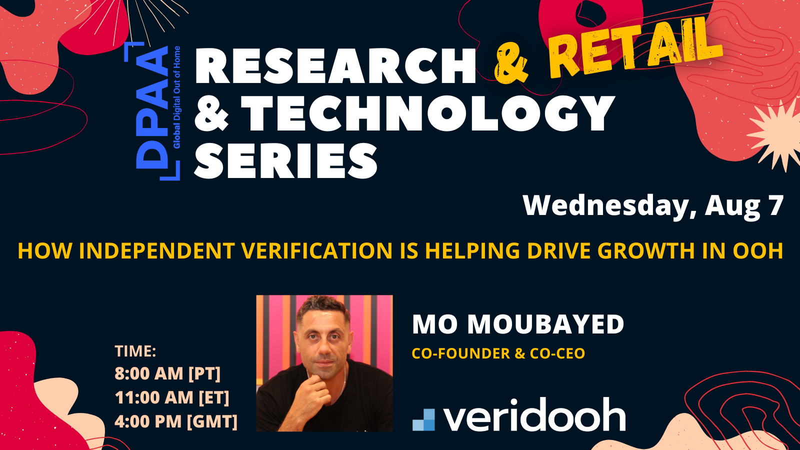 NEW YORK – – DPAA, the global trade marketing association, driving the growth and digitization of out-of-home (OOH) media announced today that Mo Moubayed, Co-Founder of Veridooh will speak at its next Research, Retail & Tech webinar on August 7 at 8am PT/11am ET/4pm GMT. The topic for the session will be How Independent Verification is Helping Drive OOH Growth. The session is open to DPAA members only, please contact your DPAA representative or info@dpaaglobal.com.