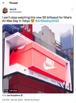 In March 2022, Nike installed a giant 3D digital billboard ad in honor of Air Max Day. This billboard debuted in Tokyo, Japan and was designed by Kota Iguchi and his team. The ad displayed a huge Nike shoe box which opened to bring to life various Air Max designs with charm and whimsy.
