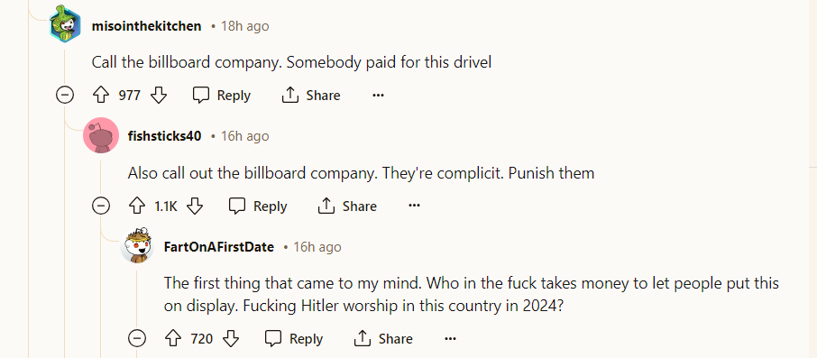 However, some Redditors are willing to give 5Star Outdoor and Billboard4me the benefit of the doubt. Perhaps the billboards were compromised. After all, they are digital. “Even the most racist billboard owners don’t want to deal with national press,” writes Grandpas_Spells.